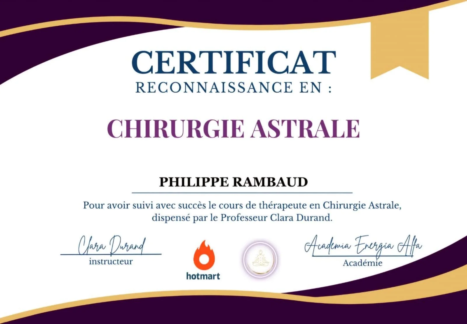 J’ai suivi plusieurs formations en Magnétisme, en Énergétique, en Chirurgie Vibratoire, en Quantique, ce qui m’a permis d’être plus précis, de structurer mes ressentis naturels et d’apprendre à canaliser l’énergie pour aider les autres.